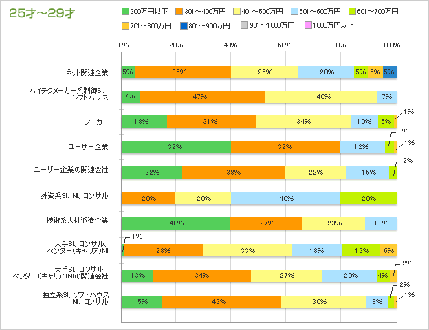 TOP>キャリアアップ> 第35回:外資系SIerとソフトハウスの給与はどれだけ違う? IT転職百科事典 第35回:外資系SIerとソフトハウスの給与はどれだけ違う? 編者:Tech総研 2007/7/11 次のページ 今回の調査対象はIT関連業務に就く3090人。年齢は20代後半から40代前半までで、最も多いのは30〜34歳層だ。男性が全体の87%を占める。勤務地は全国。勤務する企業の業態は、SIer、ソフトベンダー、コンサルタントファーム、メーカー、一般事業会社の情報システム部門、技術系人材派遣会社など多岐にわたる。独立系のSI、NI、ソフトハウス、コンサルが33.3%、システム開発を主としないユーザー系企業の情報システム部門が13.7%、大手企業のシステム子会社が10.9%、メーカーが10.6%となっている。企業規模は100〜500人というのが最多帯だ。 職種別では、アプリケーション開発(Web、オープン系)(27.2%)を筆頭に、運用・監視・テクニカルサポート(14%)、社内SE(11.2%)などがあり、ITのほぼ全職種をカバーしている。これらのデータを、業態と役職、年代、地域などの設問に対して有効回答者のみを抽出し、クロス集計しながら、年収の分布を調べた。 20代後半(25〜29歳)では、年収300万円台(301〜400万円)が全体の36%、同じく400万円台が28%を占めていた。300万円以下の層も18%あり、全体として500万円以下の層が8割以上。その中で年収の業態別分布状況を見ると、業態による年収格差が見えてくる。例えば「外資系SI・NI・コンサル」では500万円台が40%と最多ゾーンであり、全体に年収は高い。一方で、「技術系人材派遣会社」では最多ゾーンは300万円以下(40%)だった。 これが30代前半(30〜34歳)になるとどうなるだろうか。回答の最多帯が500万円台になっているのは、「システム開発を主としない企業(=ユーザー企業)のシステム専門子会社」「ネット関連」「外資系SI」「大手SI」の4つで、それ以外の「ハイテクメーカー系の制御SI」「大手SIの子会社」「独立系SI」などは、400万円台にとどまっている。親会社と子会社間で格差が生じている傾向もうかがえる。 ここでも「人材派遣会社」は最多帯が300万円台にとどまっている。半面、外資系ではこの年代になると、1000万円以上の年収を得る人が8%を占める。最高と最低ランクを単純に比べると、同じ年代で3倍以上の差が開いていることになる。 若年層では年収のピークは1つまたは2つのゾーンに集中する傾向があるが、年代が上昇するにつれて、分布が広がり、結果的にピークはなだらかになる。これは、年齢の上昇によって一つの企業内でも、年収格差が広がることからも、当然の現象といえるだろう。 たとえ同じ業態に勤務していても、年齢が上昇するにつれて、年収格差は広がる。例えば同じ業態の「大手SI・コンサル・ベンダー」に勤務していても、30代後半(35〜39歳)になると、年収400万円台にとどまる人が11%いる一方で、年収800万円台の人も同じく11%存在するという状況が見られるようになる。個別企業間の業績の差、個人の業績の差が年収に反映される傾向は、年代が上昇するにつれて顕著になる。 DATA1 年代で比較!勤務先企業で年収はこんなに違う (画像をクリックすると別ウィンドウに拡大図を表示します) では30代以上はどれくらい差が開いているのか。そして役職別ではどのようになっているのか。実は業種や企業形態によっても大きな差が開いているようだ。 続きはこちら>> 次のページ IT転職百科事典 第1回 都心vs地方の最大格差は2割! 地域別年収差を徹底比較 第2回 もしも平賀源内が35歳でレジュメを書いたら 第3回 KDDIテクノロジー斉藤社長が欲しい「究極のレジュメ」 第4回 一般人理解不能…ここまでズレてる「エンジニア時間」 第5回 大手ITベンダー“在宅勤務”一斉導入の真意 第6回 IT業界の給与格差を探る!元請と下請でいくら違う? 第7回 仕事の“やり損”を回避せよ!世渡り上手な自己PR術 第8回 外国人のホンネ「ソコがヘンだよ!日本人エンジニア」 第10回 業種明暗も!2006年冬のエンジニアボーナス平均80万円 第11回 梅田望夫氏が提案“2007年ITエンジニア進化論” 第12回 年収250万円未満で働く30代エンジニアの胸の内 第13回 人事が証言!大手が若手IT技術者を欲しがる理由 第14回 転職で年収アップを狙え!大作戦/レジュメ・面接編 第15回 世界に知られるオープンソース言語「Ruby」を作った、まつもとゆきひろ 第16回 次世代Webサービスの本命、SNSの展望 第17回 男性の皆さんわかってよ!女性SEの仕事へのキモチ 第18回 バブル時代が懐かしい?エンジニア福利厚生の実情 第19回 IT企業の悪しき慣習を破る!技術屋社長の社内制度 第20回 「あるある」「ねーよ!」巷のエンジニア都市伝説 第21回 登大遊@PacketiXは好奇心の振幅が非常に広い 第22回 職種別 採用天気予報 [07年4〜6月期] 第23回 2万人の年収比較!IT系職種は本当に給料が安い? 第24回 我ら“クレイジー☆エンジニア”主義!世界初!量子テレポーテーションを成功させた古澤明 第25回 IT系300人に質問☆○○だと思う企業ランキング 第26回 ”ヒーローエンジニ