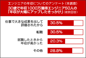 TOP>キャリアアップ> 第42回:30歳年収1000万エンジニア51人のキャリア図鑑 IT転職百科事典 第42回:30歳年収1000万エンジニア51人のキャリア図鑑 編者:Tech総研 2007/9/5 次のページ エンジニアは、今や売り手市場。転職を繰り返し、さらなる年収アップを狙っている人も多いだろう。しかしその一方で、いわゆる“エンジニア35歳引退説”が、まことしやかに流れているのも事実である。では、30歳で年収1000万円というひとつのハードルを越えた人たちとは、一体どのような人物像なのだろうか。そこで実際に30歳前後で年収1000万円を獲得したエンジニア50人を対象に、アンケートを行った。まず、いちばん気になる大幅な年収アップのきっかけは、「仕事で大きな成果を出し、評価された」「転職」が同率1位。その後に、「就職したときから年収が高かった」が続く。この結果を踏まえ、識者に意見を伺いながら、年収1000万円を獲得できた背景を探りたい。 株式会社プラネットファイブ代表取締役今までに2万人以上の面接を行ってきた人材コンサルタントであり、出版や映画のコンテンツプロデューサー。株式会社リクルートにて就職情報誌および転職情報誌の編集長、ギャガ・コミュニケーションズにて映画プロデューサー、キネマ旬報社にて代表取締役専務を経た後、現役職に就任したという異色の経歴の持ち主。主な著書に、『あなたが年収1000万円稼げない理由。—給料氷河期を勝ち残るキャリア・デザイン』(幻冬舎)などがある。 国内と海外に製品セミナーを実施し、高い評価を得た。34歳、セールスエンジニア前年比400万円アップ 新しい部署を2つ立ち上げて、軌道に乗せた。30歳、コンサルタント前年比300万円アップ 大規模PJの品質・生産を向上させ、収益を予定より大きく増やした。35歳、テクニカルマーケティング前年比200万円アップ 年俸制や裁量労働制の導入により、仕事での報酬に対する価値観が、ここ数年でがらりと変わった。そのことを、肌で感じているエンジニアも多いだろう。「差がつかないと、サービスの向上は期待できない。そこで、昔のように差がつかないことが公平なのではなく、努力によって差がつくことが公平だと考えられるようになったのです」と、田中氏も話す。確かに前述したアンケートの結果でも、「仕事で大きな成果を出し、評価された」ということが、年収アップのきっかけ第1位になっている。一概に評価といっても、年収そのものがアップするケースと、昇進したことにより年収がアップするケースがあるが、いずれにせよ年収がアップするのであれば、エンジニアのモチベーションも変わる。「成果を上げたことによる年収アップは、最高で100万円が私の実感値でした。しかし、アンケート結果のように、200万〜300万円アップしているとなると、その上がり幅は確実に広がっている。特に外資系の企業では、スキルがはっきりしている理系のエンジニアは高評価されやすいので、このような結果になったのでしょう。しかしその一方で、成果が出せない場合の評価も、顕著に現れます。年収が下がるだけではなく、最悪の場合解雇されるケースも。勤続年数や年齢ではなく、仕事で評価される昨今の価値観は、“諸刃の剣”でもあるのです」。成果を評価されたことによる年収の増減は、シビアな現実となってエンジニアの肩にのしかかる。 最も若いメンバーながらリーダーになり、新規事業の立ち上げから運用、販売まですべてをこなしたことが、社内で評価された。34歳、テクニカルサポート2年連続前年比100万円アップ 新製品の立ち上げプロジェクトでリーダーを任され、課題が多かったが、予定どおり立ち上げることができた。40歳、機械・機構設計前年比100万円アップ 営業技術として働いていたが、そこでの仕事が認められて、別の部署のマネジャーに昇格した。32歳、テクニカルサポート前年比200万円アップ かつてはその業界・業種・業務のスペシャリストであれば、それ相応の給与を得ることができたエンジニア。しかし、昨今ではそれ以外の能力も求められている。「今、最も企業にニーズがある人材は、マネジメントスキルがあるエンジニア。ひとつの技術に精通しているだけでは、年収1000万円は望めません。さらに、プラスアルファで何ができるか。つまり、ほかのエンジニアとの差別化が求められているのです。マネジメントスキルがある人とは、単にチームをまとめるだけではなく、売れる技術とは何かを考えることができ、主体的に動ける人のこと。人材の価値は、ちょっとしたことですぐに跳ね上がるのです」。 では、まだマネジメントする立場にないエンジニアは、どう鍛えていけばよいのか。「常に、自分より上流の人、例えばプロジェクトリーダーやマネジャーの立場になって、物事を考えることです。ただ指示されたものを提供していくだけでは、いつまでも成長が望めません。今後、エンジニアが年収1000万円を獲得することは、キャリア展開次第