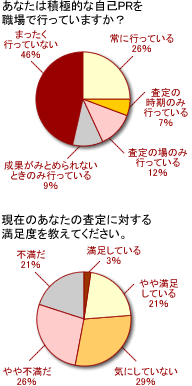 TOP>キャリアアップ> 第7回:仕事の“やり損”を回避せよ!世渡り上手な自己PR術 IT転職百科事典 第7回:仕事の“やり損”を回避せよ!世渡り上手な自己PR術 編者:Tech総研 2006/12/13 次のページ 職場での評価に対するアンケートの結果から、特に注目したいのが、自己アピールに対するエンジニアの消極的なところか。いったい何が原因なのか、データの中身を見てみよう。 左に図を見てほしい。「あなたは積極的な自己PRを職場で行っていますか?」という質問をグラフにしたものだ。その結果、「常に意識をもって行っている人」が26%にとどまったのに対し、「まったく行っていない」というのが46%と約半数を占めていたのだ。逆に「現在のあなたの査定に対する満足度を教えてください」というアンケートに対しては「やや不満だ」が26%、「不満だ」が21%となり、こちらも半数近くのエンジニアが評価を快く感じていないという結果が出た。 また、グラフはないが、自己PRと満足度をクロス集計したところ、自己PRは「まったく行っていない」が、査定は「やや不満」「不満」だと感じているエンジニアは46%と約半数に及んだ。特に自分をアピールするわけではないが、査定には不満があるというエンジニアの姿が浮き彫りになったわけだ。技術職なので渡世術的な自己PRは苦手という人も多いだろう。しかし、やはり社会においては自分を見せることがうまい人間ほど、早く高みにいけるのが実際なのだ。ほんのちょっとの努力でいまのポジションから上にいける可能性があるのならやっぱり自己をアピールすることは大切だろう。 そこで今回はそうした努力をした結果、環境が改善できたという具体例を紹介すると共に、自己PRについて徹底的に掘り下げていきたいと思う。では、まず成功例から見ていくことにしよう。 自己PRすべき直接の相手は日ごろ接している直属の上司になる。上司にもいくつかのパターンがあり、それぞれ対応も違う。ここでは成功例から導き出される具体的な対策をみていきたいと思う。 29歳 男性 神奈川県 システム開発(マイコン・ファームウェア・制御系) 年収520万円(うち残業代100万) 人の好き嫌いが比較的激しく、人によって態度が違う。自分は好かれているほうだと思うが、嫌われたら大変そう。 成果主義。半年に一度チャレンジ目標設定と前の期の評価を実施。面談により評価(ボーナス)が決まる。また、1年に一度自分の職務ランク付けを実施し、面談後に評価が決定し、給与へ反映。 重要なメールに関してはCC/BCCにいれたり、また客先の直属上司から自分の直属上司に連絡を入れてもらったりした。以前から常に実施しているので、給料が上がった実感はないが、同期の中では一番評価が高い。給料には一応、満足はしているがもっと給料は上げてほしい。 39歳 男性 埼玉県 システム開発(Web・オープン系) 年収700万円(うち残業代30万円) 見てないようで細かなところまで見ていて、困っている顔をすると何げなく声をかけてくれる。技術の知識も豊富で、とても信頼できる。 完全な成果主義ではないが、まず半期目標を設定し、半期ごとに目標と成果について上司との面談を行い、賞与査定、昇進などに反映される。 上司に解決策を考えさせるなと、新入社員のときの上司に仕込まれたので、具体的な解決案の提示は以前から常に行っている。また、報告という形を使って、多くの仕事をこなしていることをアピールした。結果として専門学校卒だが、大卒の同期よりも早く、トップで主任クラスに昇格した。 どのように自己PRを進めていけばいいのか。ワンランクアップを目指すPR術について、上司のタイプ別にテクニックを紹介していく。 続きはこちら>> 次のページ IT転職百科事典 第1回 都心vs地方の最大格差は2割! 地域別年収差を徹底比較 第2回 もしも平賀源内が35歳でレジュメを書いたら 第3回 KDDIテクノロジー斉藤社長が欲しい「究極のレジュメ」 第4回 一般人理解不能…ここまでズレてる「エンジニア時間」 第5回 大手ITベンダー“在宅勤務”一斉導入の真意 第6回 IT業界の給与格差を探る!元請と下請でいくら違う? 第7回 仕事の“やり損”を回避せよ!世渡り上手な自己PR術 第8回 外国人のホンネ「ソコがヘンだよ!日本人エンジニア」 第10回 業種明暗も!2006年冬のエンジニアボーナス平均80万円 第11回 梅田望夫氏が提案“2007年ITエンジニア進化論” 第12回 年収250万円未満で働く30代エンジニアの胸の内 第13回 人事が証言!大手が若手IT技術者を欲しがる理由 第14回 転職で年収アップを狙え!大作戦/レジュメ・面接編 第15回 世界に知られるオープンソース言語「Ruby」を作った、まつもとゆきひろ 第16回 次世代Webサービスの本命、SNSの展望 第17回 男性の皆さんわかってよ!女性SEの仕事へのキモチ 第18回 バブル時代が懐かしい?エンジニア福利厚生の実情 第19回 IT企業の悪しき慣習を破る!技術屋社長の社内制度 第20回 「あるある」「ねーよ!」巷のエンジニア都市伝説 第21回 登大遊@PacketiXは好奇心の