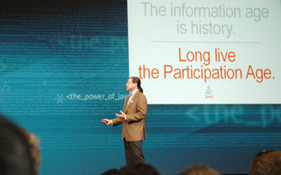 初日の基調講演でJonathan Schwartz氏はInformation Ageは終わり、今後はParticipation Age(参加・協調の時代)だという。これは、現在までは情報が常に一方通行であったものが、誰もが参加し相互に情報を交換し合うものだという。blog、Wikipediaなどを例にとり、その時代が来ていることを告げた。