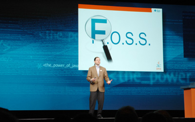 また、FOSSを強調する。Apache、Eclipseなどがここまで発展しきた理由にはフリーであることが重要だったのではないかとし、さらなるオープン化を進めてコミュニティの発展に貢献していくとのこと。これに合わせてオープンソースのアプリケーションサーバ「Glassfish」を発表した。Sunはオープン化を歓迎し、コミュニティへの参加を呼びかけた。
