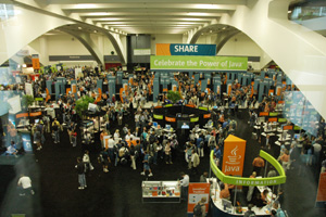 ![]() impress TVにて 映像配信中! JavaOne Pavilionでは、Oracle、BEA Systems、NOKIAなど100近くの企業・団体が出展していた。 会場内ではSHAREと掲げる旗や幕が目立つ。これは、Sunの今後の方針を意識したものだ。一昔のSunといえば、MicrosoftやIBMとの険悪な雰囲気を感じられたが、それを一変させられる。先のレポートでもお伝えしたが、Sunはオープン化を進め、コミュニティの発展を目指すということであり、その改革が展示会場でも窺えた。John Gage氏の話では、Scott McNealy氏に子供ができ、考えが変わったのではなどとも。 ![]() ![]() いたる所にSHAREと見えるSunブース周辺 また今回、Microsoft社がはじめて出展している。この意味はSunやJavaのコミュニティにとって大きい。今後は協力体制を敷いていくのかどうかが気がかりになる。 ![]() 出展した意味は大きいMicrosoftブース | ||||||||||||||