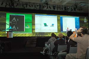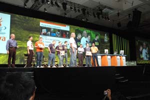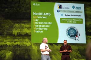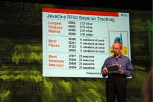 同カンファレンスで登録処理を済ますとIDカードが手渡される。このIDカードはSun-Ray(シンクライアント)のログインカードにもなっており、各セッションの受付処理にも使われる。このIDカードを使って誰が一番多くの講演に足を運んだかなどの集計が行われた。同時に6つの講演に参加した人がいるなど会場をわかした。 ![]() | ||||||||||||||