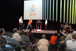 Tシャツ遠投大会もついにファイナル。今回はテコの原理を使った投石機のようなものだ。物理力学を使ったシンプルなこの装置だが、初投から快調に飛ばし大成功をおさめた。これに対してJames Gosling氏は「シンプルが一番。ソフトウェアの開発にも通じるだろう?」という。 ![]() ![]() | ||||||||||||||