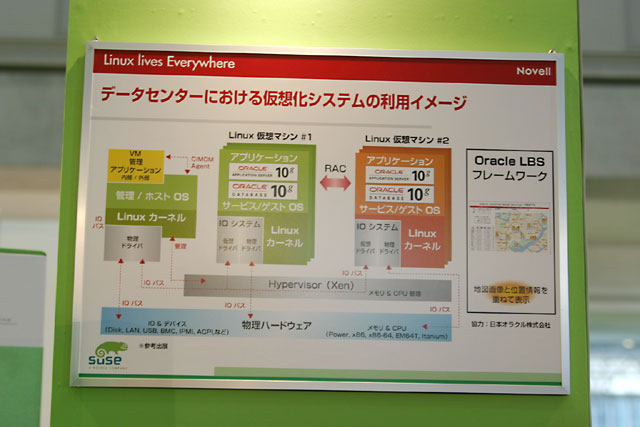 「Data Center」ではNovell SUSE Linux Enterprise Server 9やデータセンターにおける仮想化システムの利用イメージなどを紹介していた。Xenを用い、2つのゲストOS上でOracle RACを構築して利用する事例を紹介していた。 |