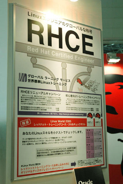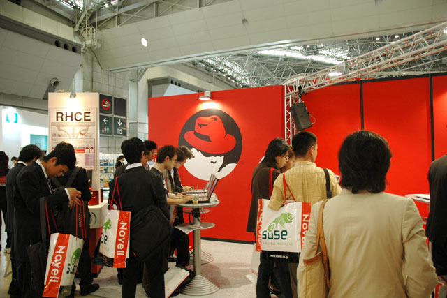 レッドハットのブースでは、同社が行っているトレーニングコースのスキルチェックテストを受けることができる。ブース内にセミナースペースが用意されており、教育サービスやコンサルティングサービスの紹介が行われている。4月に日本で販売が開始されたRed Hat Enterprise Linux 4については、各ベンダーブースで期間中にセッションが行われる予定だ。カーネル2.6を搭載した同OSについての最新情報を知りたい方は、ベンダーブース内でのセッションも注目だ。 |