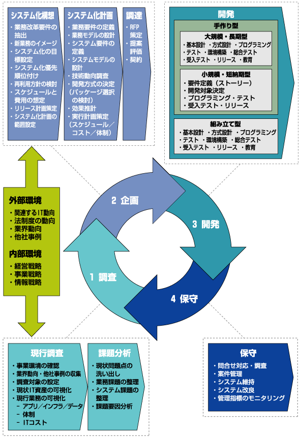 組織としてシステム構築のプロセスを標準化し、測定、改善するには、米国カーネギーメロン大学ソフトウェア工学研究所が開発した、ソフトウェア開発プロセスの評価モデル(能力成熟度モデル)であるCMM(Capability Maturity Model)などが参考になる。 多くの企業では、主要業務領域のシステム化は一巡したといってもよい。これからのシステム構築は、事業やサービスの創造や情報活用支援といった戦略的領域をサポートするための新規システム構築と、従来の業務効率化のために構築された既存システムの拡張・再構築が大半を占めることになると思われる。 したがってこれからのシステム構築では、既存のシステム資産をできる限り再利用することにより、システムの品質、コスト効率、実現スピードを向上させることが求められる。ここで既存システム資産の中には、ハードウェア、ソフトウェアだけでなく、モデル・仕様・アルゴリズム・データなども含まれる。 これからのシステム構築プロセスは、企画して開発して本番稼動させればそれで完了ということにはならない。その後の保守、再利用のための調査、そしてあらたな再構築にむけた企画という一連の流れを、システムのライフサイクルとして捉える必要がある(図1)。 |