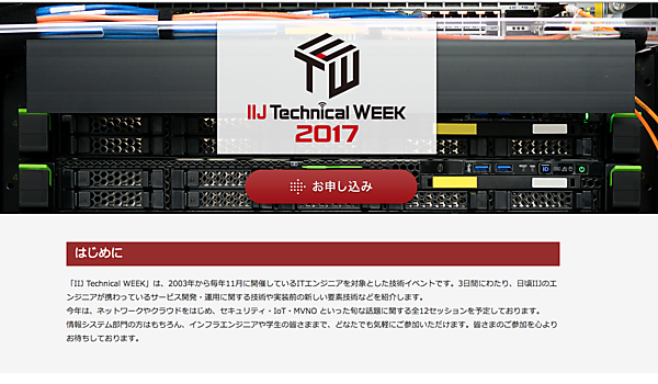 IIJは毎年恒例となっているエンジニアを対象とした技術イベント「IIJ Technical WEEK」を11月8日から10日の3日間にかけて開催する。日頃IIJのエンジニアが携わっているサービス開発・運用に関する技術や実装前の新しい要素技術などが紹介される。
