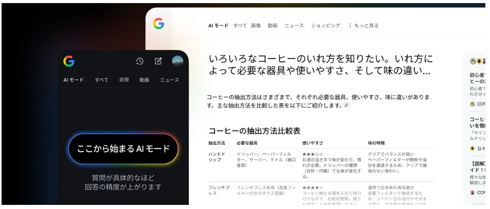 Googleは検索の「AIモード(日本語)提供を開始し、回答提示型の探索が一般化しつつあります。企業や自治体の情報発信は、SEOだけでなく生成AI最適化(AIO)」や責任ある運用の整備が重要になります。