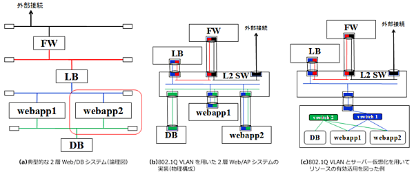 正直に実装すると色分けされたセグメント分だけのイーサネット・スイッチが必要となりますが、必要とするポート数は2-3ポートなので非常に無駄が多くなります。 このため、物理サーバーに802.1Q タグVLANを解釈させることでイーサネット・スイッチの集約をはかります。 色分けされたセグメントをそれぞれイーサネット・スイッチ(L2SW)の各ポートにVLANとして割り当てたところを示したのが、図5-bとなります。 図5-aのセグメントの色と図5-bの各ポートから出ているタグの色を合わせてありますので、注意が必要です。