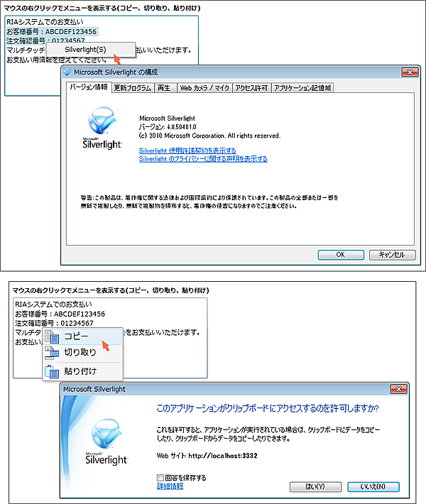 | 図4:マウスイベントとクリップボード・アクセス。(上)デフォルトの場合、(下)ユーザー独自のメニューを実装した場合。(クリックで拡大) |