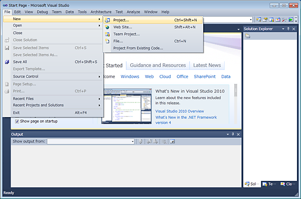 ではまず、Visual Studio 2010を起動してください。初回起動時にメッセージが表示されますので、ここでは「General Development Settings」を選択します(図6)。新規プロジェクトを作成するため、[File/New/Project]を選択します(図7)。