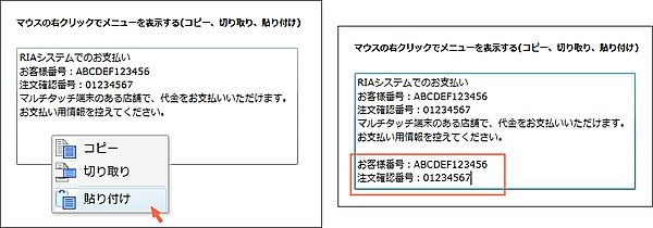 まず、表示されているテキストを選択し、マウスの右クリックで表示されるメニューから「コピー」あるいは「切り取り」を実行します。すると、「クリップボードへのアクセス許可確認」のメッセージが表示されます(図1)。ここで[はい(Y)]を選択すると、「貼り付け」によって、文章を貼り付けることができます(図2)。
