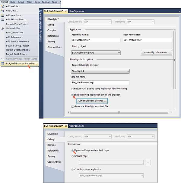 VS 2010のメニューから「Project/SL4_WebBrowser Properties」を選択し、「Silverlight」ペインの「Enable running application out of browser(アプリケーションのブラウザ外実行を有効にする)」にチェックを付けます。