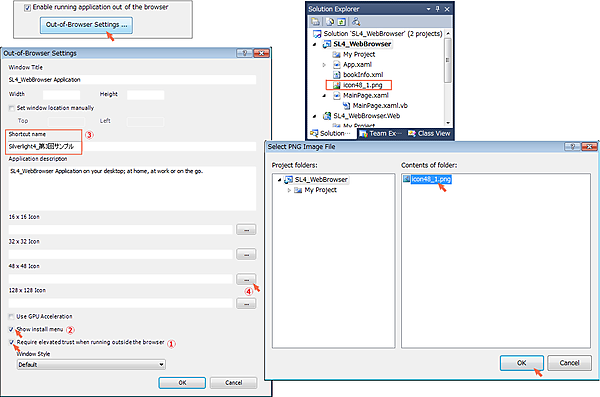 「Shortcut name」は、仮に「Silverlight4_第3回サンプル」と指定しておきます(図5 [3])。また、先のXML文書ファイルの追加と同じ手順で、 48×48サイズのアイコン用画像ファイルを追加しておき、これを参照して設定します(図5 [4])。 アイコンの画像ファイル(icon48_1.png)は、ダウンロード用サンプルには追加済みです。