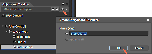 次に、アニメーションを設定していきます。「Objects and Timeline」から「+」アイコンをクリックして、新規ストーリ・ボードを作成します。Name(Key)はデフォルトの「Stroryboard1」としておきます(図5)。