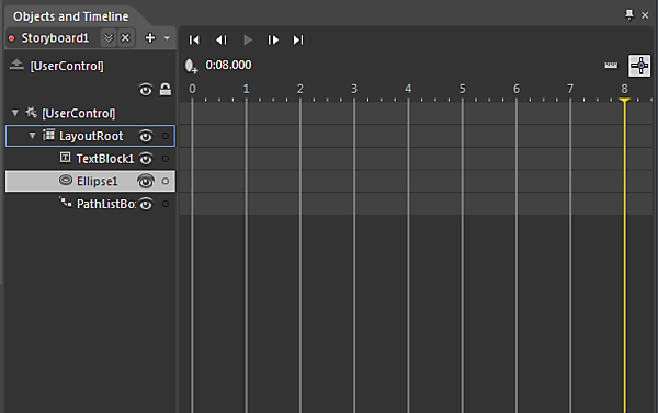 「Objects and Timeline」からEllipse1を選択し、黄色い再生ヘッドを「8」の位置までドラッグします(図7)。Ellipse1のPropertiesから「Transform」タブを展開し、「RenderTransform」の「Rotate」を選択し、「Angle」に360と指定します(図8)。これで、8秒をかけて、楕円が360度回転するようになります。
