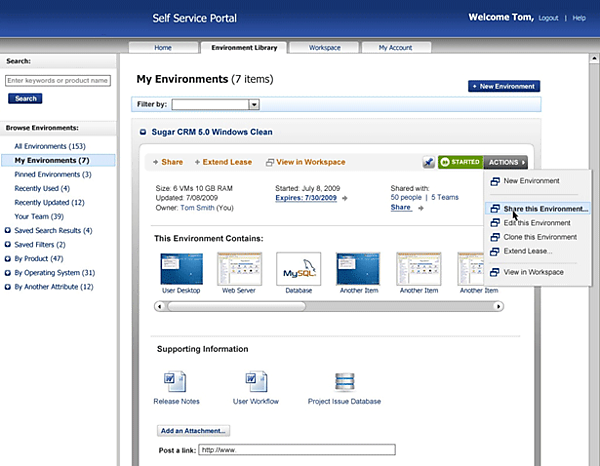Lab Managerを使うと、XenServerやHyper-Vの仮想ラボ環境(開発、テスト、サポートなど)を効率よく展開できます。また、リース期間の設定を行うことで、仮想マシンの乱立や管理の複雑さ、といった問題を解決します。さらに、ユーザーが仮想環境に簡単にアクセスできるように、セルフ・サービス・ポータル・サイトも提供します(図10)。