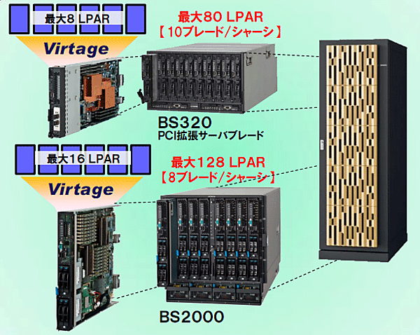 Virtageは、「BS2000」や「BS320(*1)」などのサーバー・ブレードに搭載されており、標準では2つまでのOSを動作させることができます。さらに、最大16個(「BS320」では最大8個)のOSまでを動作させられるようにするオプションを提供しています。
