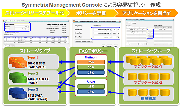 図4で示した通り、FASTのポリシーは複数サーバーで共有することが可能である。個々のサーバーごとに異なる設定を用意する必要がない。開発環境などのようにストレージの性能をあまり必要としないサーバー向けには、SSDを使わずにFCとSATAの2階層のポリシーを割り当てる、といった設定も可能である。