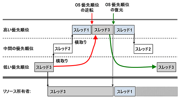 この図ではスレッド3があるリソースを所有していますが、優先順位の高いスレッド1が同じリソースをはやく使えるようにするため、スレッド3の優先順位を強制的に高めて、他のスレッドよりも優先的に処理を行うことで、スレッド3で行われていた処理を完了させ、スレッド1に制御を移します。リソースはこの時点で優先順位を変更せずに処理を継続した場合よりも短い時間でスレッド3が所有していたリソースを解放させ、スレッド1の処理に移ることができるようになるのです。