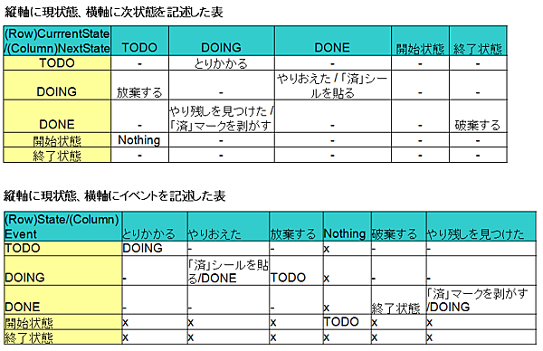 縦軸を現状態、横軸を次状態(現状態から1回遷移した状態)として、縦軸と横軸が交差するセルにイベントを記述します。この表を用いて、オブジェクトの状態遷移に抜け漏れがないことを確認できます。図3の上部の表では、現状態から次状態へ遷移するイベントがないことを「-」で表しています。
