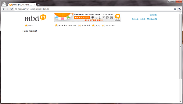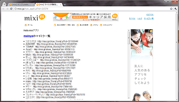 Viewer/Ownerの概念を理解したら、先程のViewerを表示するアプリを、マイミクの情報を取得するアプリに置き換えてみます。「Hello, <ユーザー名>」の下にそのマイミクのニックネームとプロフィールページへのリンクの一覧を表示するアプリです。