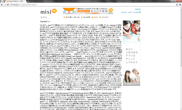 mixiアプリは、mixi上の1サービスのようにmixiのページに組み込まれた形で提供されます。mixi上でサポートされているビューは3つあります。
