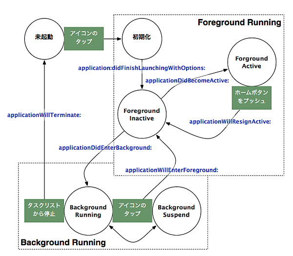 図では、緑色のボックスでユーザーの操作によって遷移が発生する場所を含めて記述しておいた。遷移の矢印線にある青い文字が、UIApplicationDelegateプロトコルで定義されたメソッドであり、言い換えればここにメソッドを記述して、遷移する段階で、自分が作ったプログラムを実行させることができるという意味である。