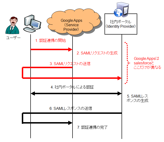 | ポイント(10) | SAMLでは、認証連携を開始する方法として、「SP-Initiated SSO」と「IdP-Initiated SSO」の2種類があります。これは、SAMLの電文がどちらから始まるかで区別されます*2。 salesforceでは社内ポータル(Identity Provider)からSAMLの電文が始まっているため「IdP-Initiated SSO」です*3。Google Appsでは、Google Apps(Service Provider)からSAMLの電文が始まっているので「SP-Initiated SSO」です。 |