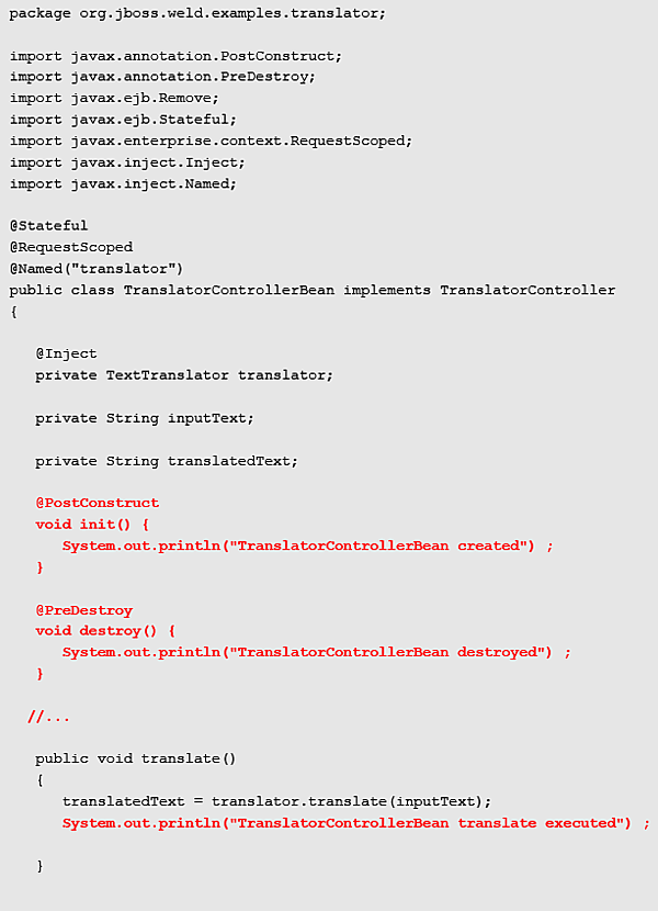CDIのDI (Dependency Injection)の部分は、依存注入する変数をアノテーションで示します。図3では、TranslatorControllerBeanの中で、TextTranslatorをインジェクションしているところがありますので以下に抜粋します。