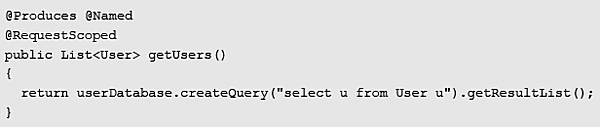 Producerの別のサンプルも紹介しましょう。Weldのjsf examplesにあるloginサンプルではDB検索の結果であるListをRequestコンテキストにバインドしています。この例では、@Namedを指定していますのでJSFのViewから名前でアクセス可能です(この場合、JSFからEL式でアクセスできる名前は"users"になります)。これはDB検索の結果をメモリ上にキャッシュしているのと同じ効果があります。スコープを@SessionScopedに変更すれば検索結果はセッションが存続する間メモリ上で保持され続けることになります。