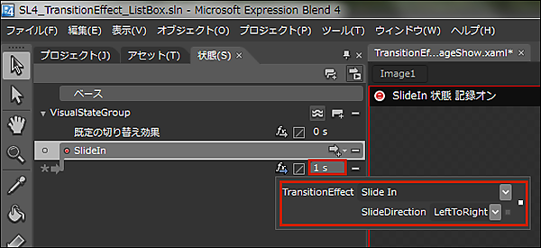 | 図13:TransitionEffectの一覧から「Slide In」を選択し、時間に1秒を指定する |