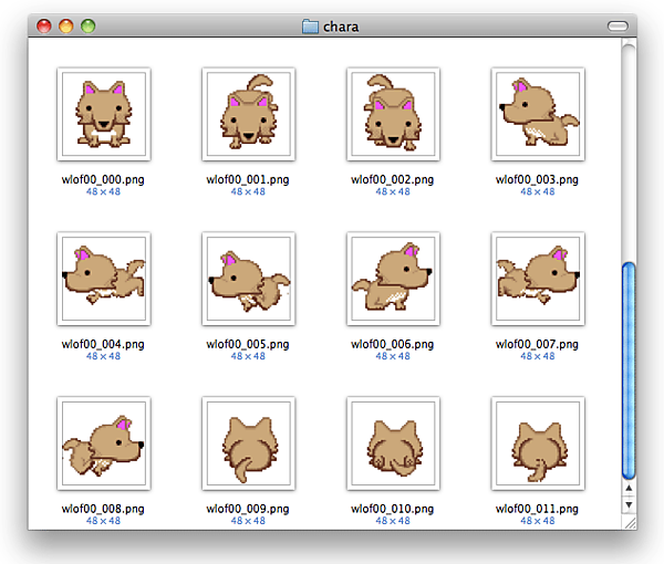 実装部の初期化メソッドにてうさぎと同じようにオオカミのビューを生成して配置する。オオカミの画像はwlof00_000.png 〜 wlof00_011.png のファイルをあらかじめプロジェクトに追加しておく。画像は前回に説明した移動パターン計12枚だ。