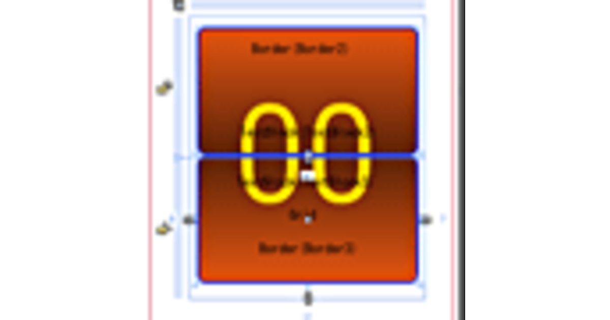 Borderの「名前」はBorder3とします。一緒にペーストされたTextBlockは削除します。Border3の中に子要素となるようGridコントロールを配置します。TextBlock2を選択してコピーし、Gridコントロールの中に子要素となるようペーストします。TextBlockの「名前」はTextBlock3とします。Border2をコピーしたため、Borderの背景色のグラデーションが、上方が明るく、下方が暗くなっています。これを上方が暗く、下方を明るくします。色の「エディター」のカラーストップを左右逆にすることで、上下の明るさを逆にすることができます。Boder2とBorder3の境目が少しあく程度に配置します。TextBlock2とTextBlock3で00が完成されるように配置します。Border3の子要素としてGridコントロールを配置することを忘れないようにしてください(図8)。