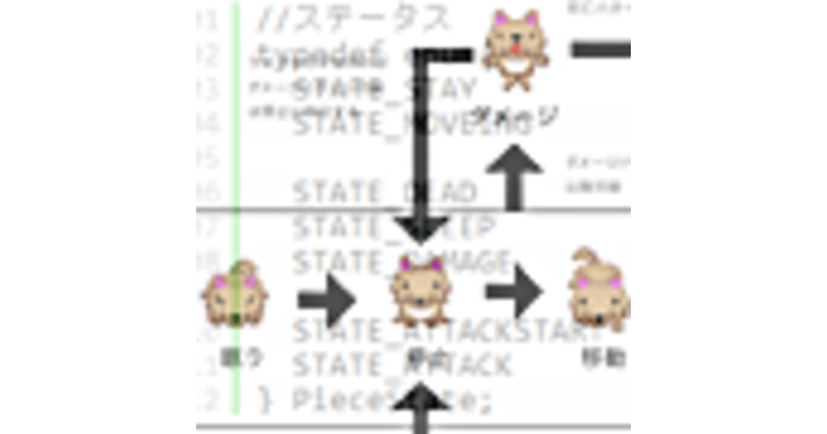 まずはキャラクターのステータスを変更する仕様をこのように決めておく事とする。動きの基本は「停止パターン」だ。何らかの動きをした後は停止パターンに戻ってくるように動かす。実際はオオカミはダメージを受けないのでダメージパターンには行かないし、うさぎも攻撃する事はないので攻撃パターンには行かないがそこはtypeプロパティーによって切り分ける。