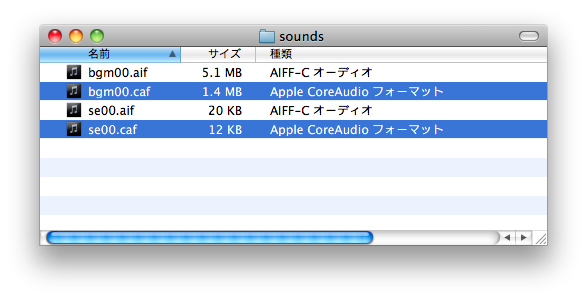 今回使用した .cafというファイルはコア・オーディオ・ファイルという、iOS / Mac OS用に拡張されたオーディオフォーマットで、iPhoneの着信音などにも使用されている。なぜ、cafにするかといえば、AIFやWAVに比べてファイルサイズを小さくできるからだ。同形式のAIFやWAVをcafファイルに変換するとサイズが以下のようになる。