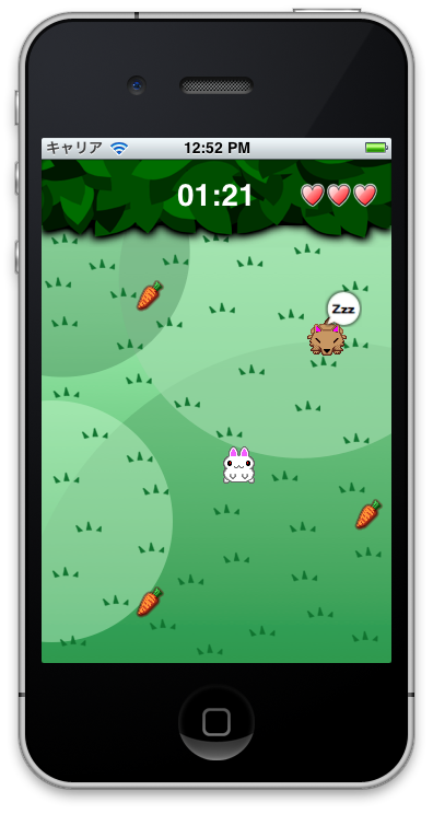 次はうさぎのライフを表示しよう。ライフ用に「ハートマーク」の画像を用意してプロジェクトに登録する。それを画面の右上に表示する。表示は前回作成した EffectViewクラスを使う。これはうさぎがダメージを受けた時にアニメーション付きでハートマークを消すためだ。このようにいろいろと汎用的に使えるクラスを作っておけば後々使い回しができて便利なのである。