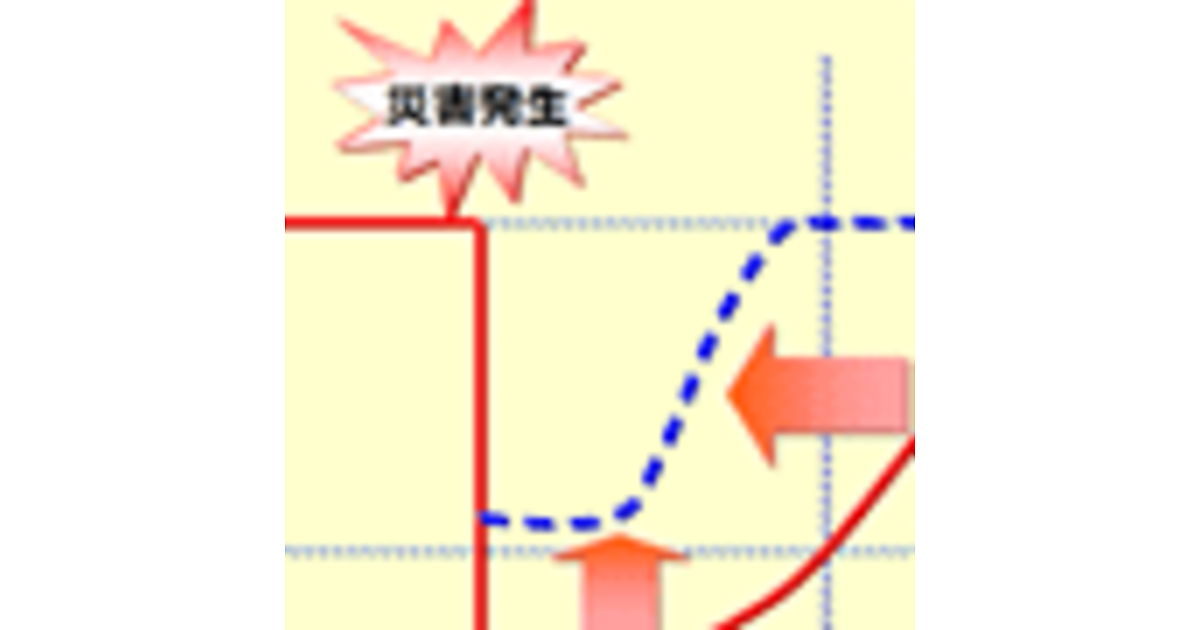 災害や事故により業務が停止してしまった場合、BCPを策定していないと操業度は災害発生と同時に一気に0%となり、赤の実線のような曲線をたどると予想される。BCPを策定している場合では青の点線に示すように、最低限の操業度を維持しながら、操業度100%である平常時まで、より短期間での回復が可能となる。