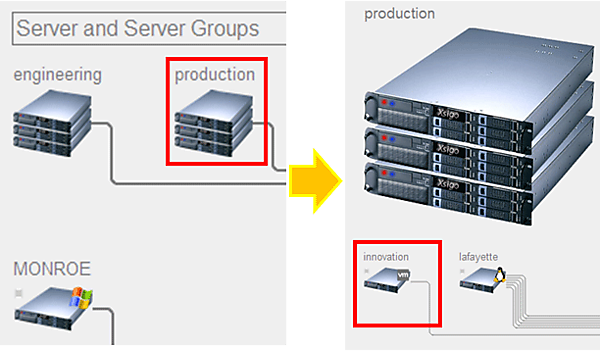 (1)“Topology View” 上のサーバーグループ “Production”をダブルクリックすると、グループ内の各サーバーが表示されます。今回増設対象のESXサーバーは “Innovation”サーバーです。
