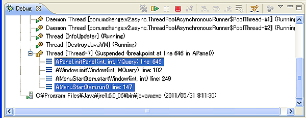 APanel.javaの646行目で停止している時は、AMenuStartItem.javaの147行目、AMenuStartItem.javaの249行目、AWindow.javaの102行目の順でメソッドが呼び出されて、APanel.javaの646行目に来ていることが分かります。
