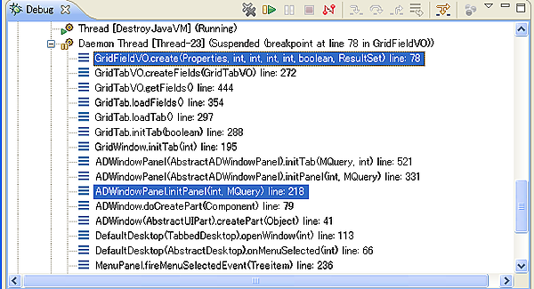 この状態でAdempiereのWebUIを操作すると、処理がブレークポイントに来た時に停止します。