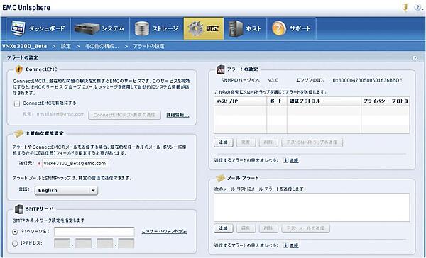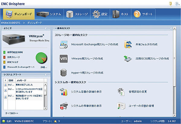 「VNXe Unisphere」は、Webブラウザで利用できるVNXeの管理ツールである。特徴の1つは、メニューの配置にある。一般的なストレージの管理ツールは機能やコンポーネントごとにメニューを配置しているが、VNXe Unisphereでは目的のタスク別にメニューを配置しておりメニューの数も少ないシンプルな画面構成となっている。 例えば、VNXe Unisphereにログインした直後に表示されるトップページでは、全体のストレージ容量を示すグラフと、システム・アラートの一覧、主要なタスク・メニューの3項目が配置されている(図8-1)。
