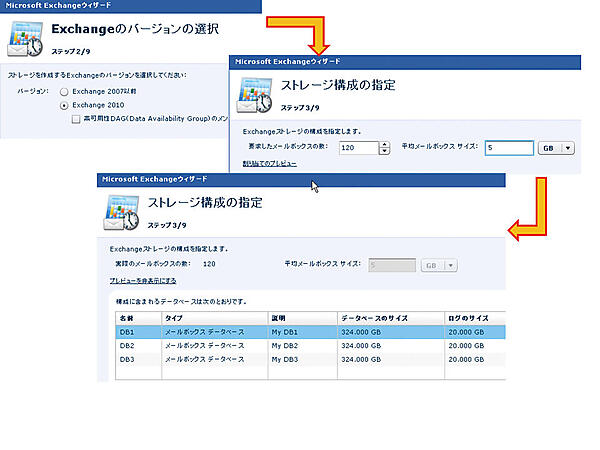 日常的なストレージの運用において、最も頻度が高い作業が、サーバへのストレージの割り当て作業(プロビジョニング)である。 アプリケーション側の要件によって、推奨されるディスクの構成が決まっている場合があるので、ストレージの構成には、その点を配慮することが望ましい。 これに対して、VNXe Unisphereでは、アプリケーションごとに最適なボリュームを割り当てる「アプリケーション・ウィザード」を用意している。さまざまなパラメータがあらかじめ設定されており、ユーザーは全く意識することなく、アプリケーションに適した設定を施すことが可能になっている。 例えば、Exchange Server向けのアプリケーション・ウィザードでは、必要なメール・ボックス数とその容量を入力するだけで、VNXeが最適なストレージ(必要サイズとボリューム数)を自動的に構成する。もちろん、必要に応じてボリューム・サイズなどを変更することもできる(図8-2)。