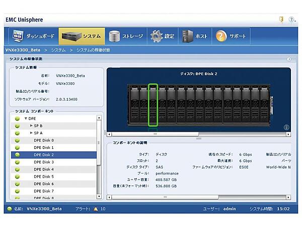 VNXe Unisphereは、システム監視も容易である。システム監視画面では、ハードウェア本体の画像とともに、該当するハードウェアのステータスが確認できる。 また、部品名の一覧とハードウェア画像が連動しているので、ハードウェアが故障した際にも、故障個所の特定が容易である。復旧作業を実施するうえでも、作業の精度を向上させる効果が期待できる(図8-3)。
