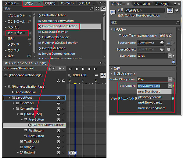 次に今作成したStoryboardと各Buttonを関連付けます。[アセット]パネルの「ビヘイビアー」を選択し、ControlStoryboardActionを「オブジェクトとタイムライン(B)」内のPrevButton上にドラッグ&ドロップします。プロパティ画面が表示されますので、[共通プロパティ]パネル内のStoryboardにprevStoryboardを指定します(図11)。