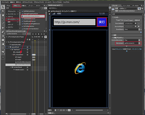 WebBrowser.xaml上の[実行]ボタンにも同様にExpression Blend 4からStoryboardを設定してください。Storyboardの名前はgoStoryboardにします(図12)。Button(uriGoButton)のタイムラインの値は表1を参照してください。