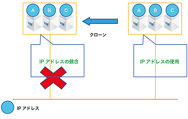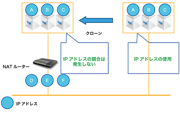 ネットワークフェンシングは、同一ネットワーク上に同一のネットワーク情報(IPアドレス、ホスト名)を持つサーバを存在させる機能です。リンククローンなどの機能があれば仮想マシンの複製は容易になり、開発・テストの利便性は格段に増します。しかし、クローンを行ってもすべての情報をクローン元とクローン先で同一にすることは困難です。それはIPアドレス、ホスト名といったネットワーク情報は基本的に同一ネットワーク上で固有である必要があるためです。