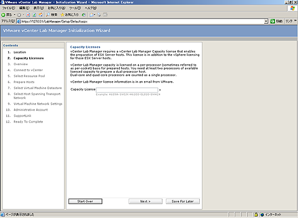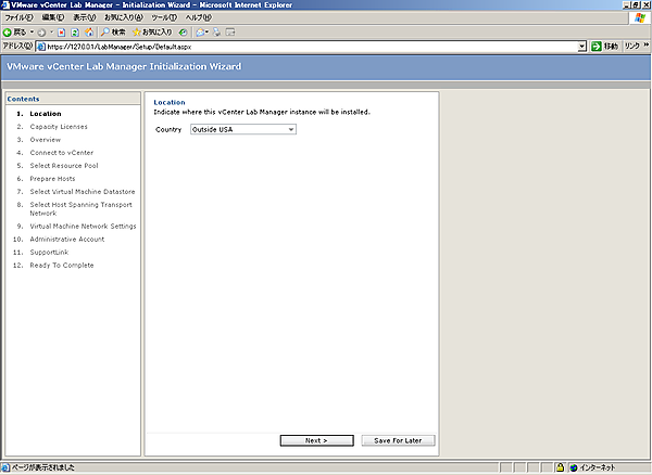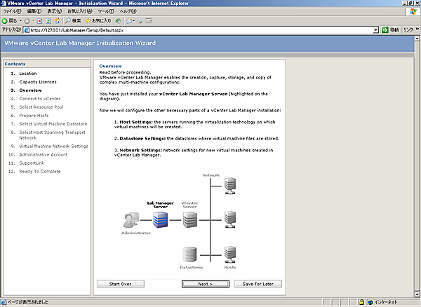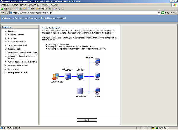 Lab Managerのインストール後には、Lab Managerの初期設定を行う必要があります。インストールの完了時に、[Launch VMware vCenter Lab Manager]にチェックを入れていると初期設定画面が立ち上がる状態になります。インストール完了時に、チェックを入れていない場合、もしくはすでに立ち上がっている画面を閉じた場合、デスクトップ上に作成される[VMware vCenter Lab Manager]アイコンをクリックすることでLab Managerへの接続が可能です。また、ブラウザに以下のURLを入力して接続することも可能です。