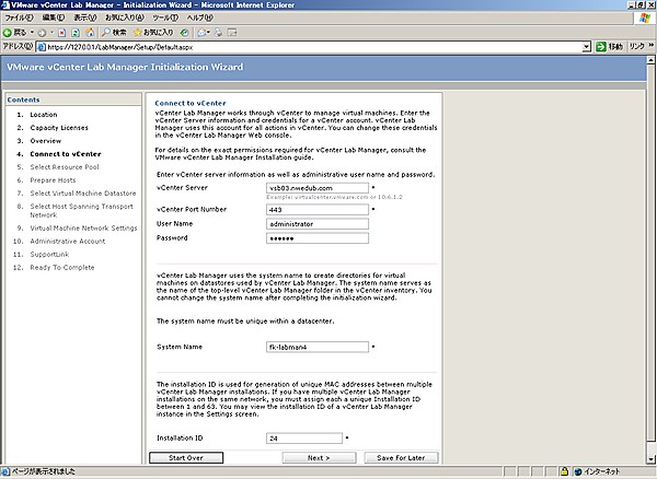 - - Installation ID……変更する必要なし。この項目は、1~63の間で指定する必要があります。この値はLab Managerで作成した仮想マシンに固有のMACアドレスを割り当てるために使用されます。通常は、デフォルトの値から変更する必要はありません。